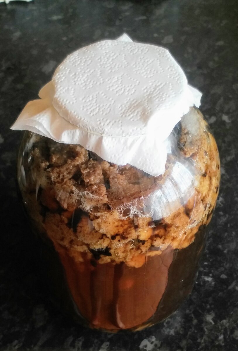 Дальше нужно накрыть бутыль марлей или салфеткой, плотно обвязав его горловину. Желательно поставить его на тарелку, потому что при сильном брожении квас может убежать.