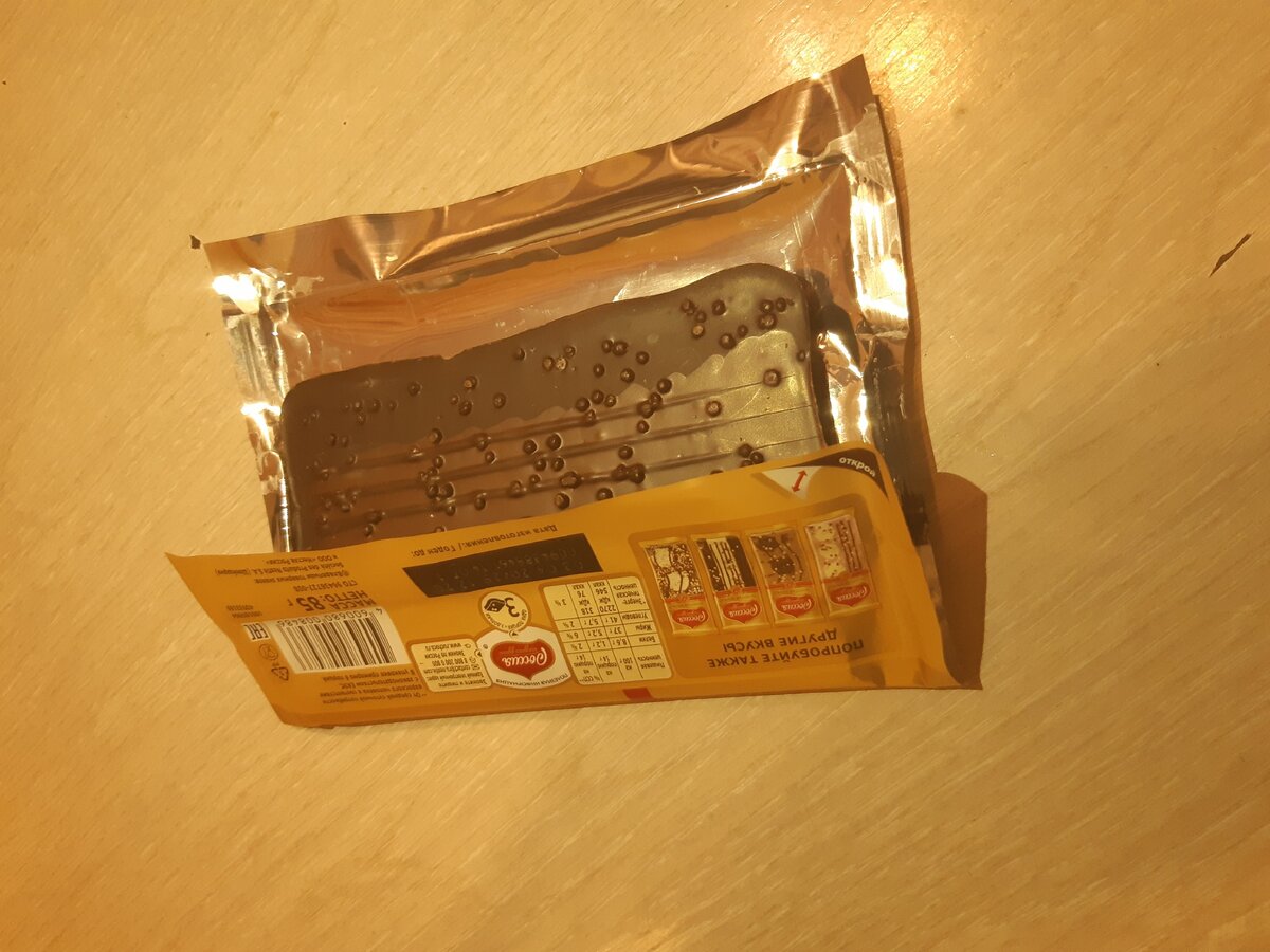 Каждый задавался вопросом, почему когда только открываешь свежую шоколадку, она лежит к верх ногами, и для чего это делают? В первую очередь на заводе при упаковке шоколадки упаковку нужно склеить, и что бы упаковка склеилась плотнее её прижимают не большим прессом, но если это делать лицевой стороной то она попросту помнется. Но на этом секрет не заканчивается, Когда вы ломаете плитку последняя отломится куда лучше если будет лицевой стороной вниз.