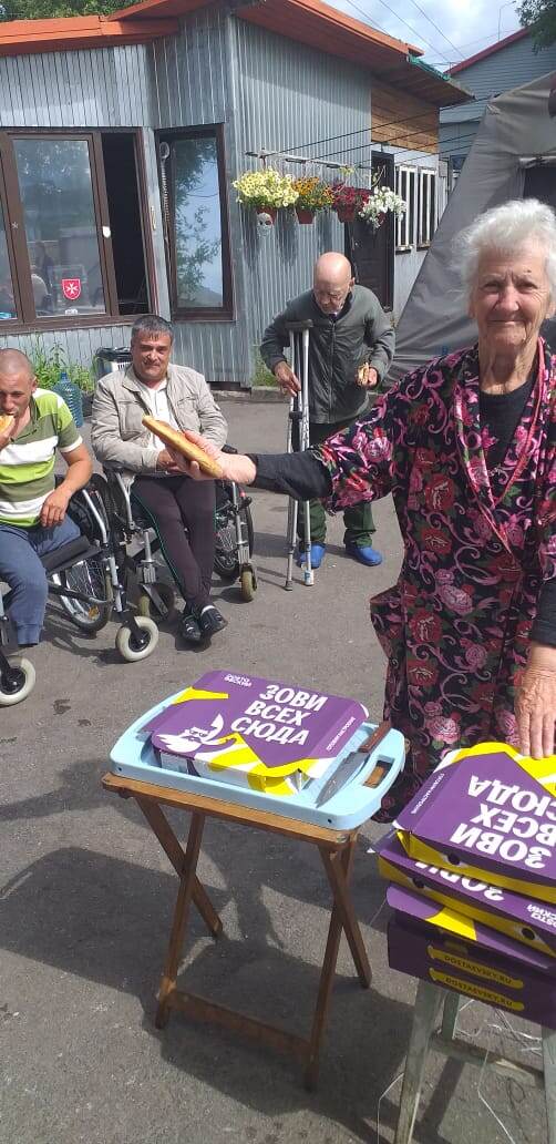 Вот и сегодня ОН снова привез бездомным инвалидам ОТМЕННЫЕ ПИРОГИ с мясом, рыбой и шпинатом. Только напрасно ОН пишет на коробках с пирогами: "ЗОВИ ВСЕХ СЮДА".