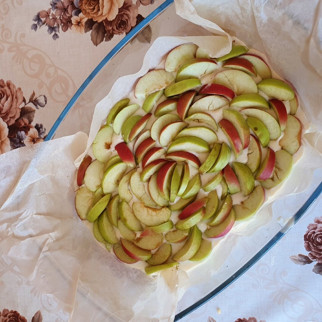 Ингредиенты: Яблоки - 300 г Мука - 300 г Кефир - 300-350 мл Сода - 0,5 ч. ложки Соль - 0,5 ч. ложки Сахар - 150 г