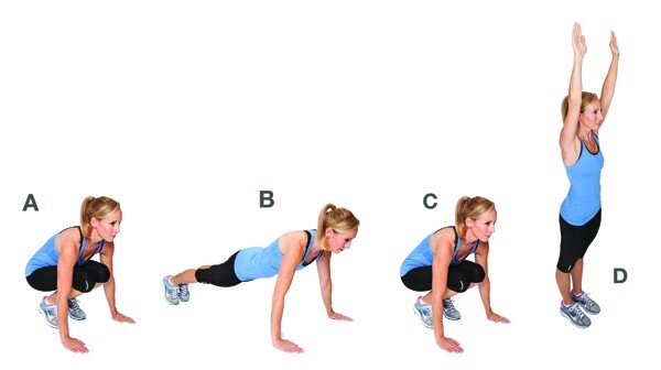 Упражнение Бурпи (Burpee) – отличный способ избавиться от лишнего жира и сделать фигуру стройнее. При его выполнении задействуются все группы мышц, и ускоряется общий метаболизм, поэтому лишние килограммы будут таять на глазах. Присядьте на корточки, выставив ладони перед собой на ширине плеч. На выдохе, сделав прыжок ногами назад, примите упор лежа на прямых руках (классическое положение для отжимания). Напрягите мышцы спины и пресса, и прыгните одновременно двумя ногами в первоначальное положение, руки должны оставаться неподвижными. Сделайте вдох и выпрыгните максимально высоко вверх, поднимая руки и расправляя плечи. Без остановки на передышку снова примите упор присев и повторите последовательность действий еще 12-15 раз в наиболее быстром темпе.