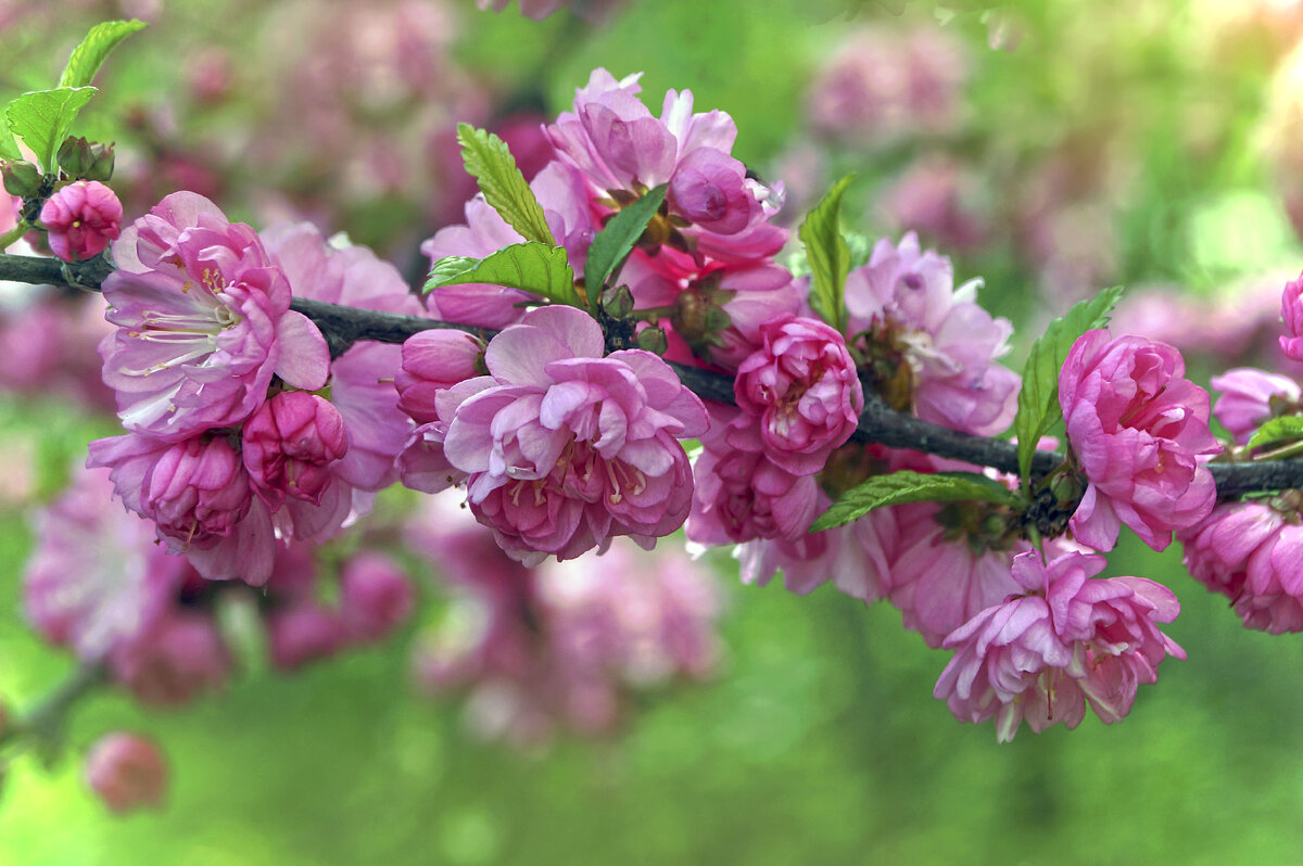 По красоте цветения луизеанию, или миндаль трехлопастный часто сравнивают с сакурой. Крупные, похожие на розочки цветки переливаются разными оттенками-от розового до пурпурного. Раскрываются они в мае, густо покрывая веточки. Цветение длиться 2-3 недели. Плоды легко опадают. У сортов цветки махровые.