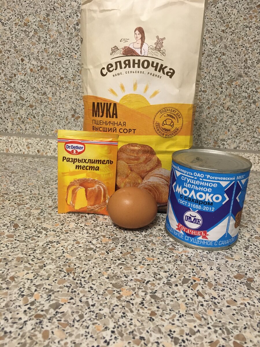 Высыпаю 2 стакана муки, добавляю разрыхлитель-перемешиваю. В отдельной ёмкости смешиваю сгущёнку с яйцом и вливаю постепенно в муку. Замешиваю тесто, оно получается очень эластичным.