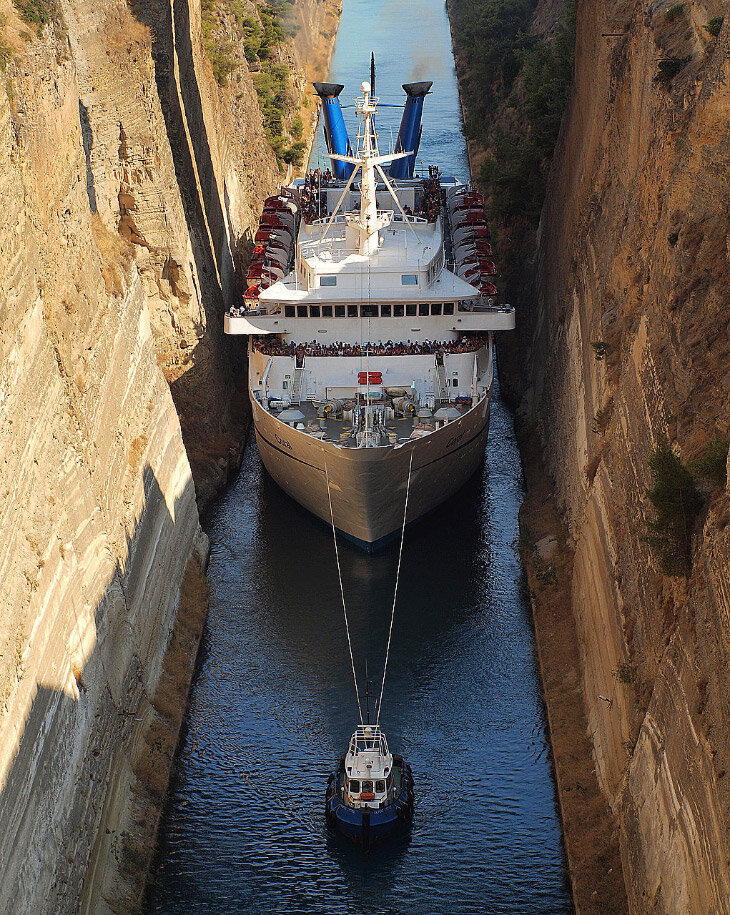 Коринфский канал — это удивительный 6-километровый судоходный канал в Греции, который соединяет Эгейское и Ионическое моря. Далеко не каждый отважится здесь проплыть. 1. Это бесшлюзовый судоходный канал в Греции, соединяющий залив Сароникос Эгейского и Коринфский залив Ионического морей. Название получил в честь города Коринфа, расположенного у западной оконечности канала. Эксплуатация канала началась в 1893 году. 2. Он считается самым узким каналом в мире для кораблей, ведь ширина канала на уровне моря составляет 25 метров, а на дне моря — 21 метр. Например, большим сухогрузам и океанским лайнерам здесь точно не пройти, а вот все остальные суда, которые вписываются по габаритам, должны проплывать это место в сопровождении специальных катеров — во избежание аварий. 3. Длина канала составляет 6 километров, глубина 8 метров. Стены канала естественного происхождения, главным образом из известняка, высота стен достигает 76 метров. 4. С древних времён делались попытки построить канал в этом