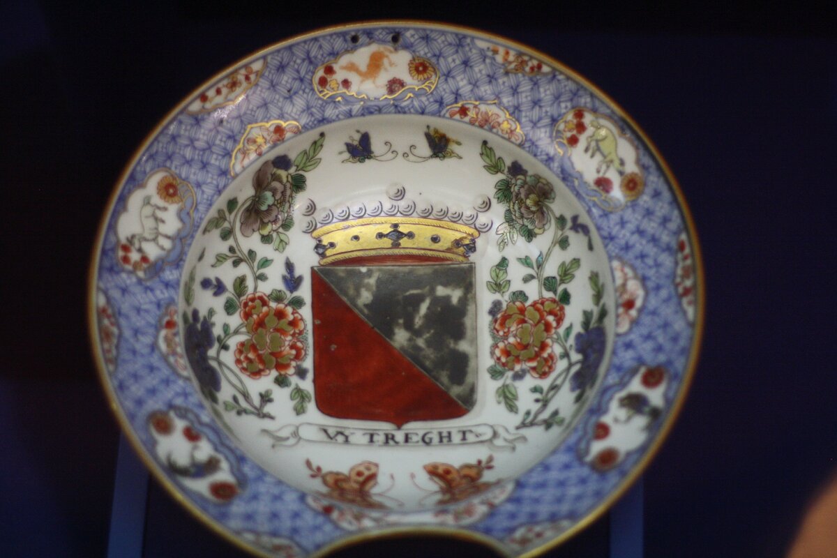 Тазик выполнен в виде небольшого глубокого блюда с полукруглым вырезом по краю борта, это выемка для шеи бреющегося человека. Весь тазик, и внутри, и снаружи – украшен росписью. Особенно замечательны изображения внутри блюда: здесь и китайские розовые и синие хризантемы, и летающие бабочки, и мифические животные... Есть и загадка, которую музейные работники еще не смогли разгадать: в центре находится родовой герб с короной и надписью «V.Y. TREGHT». Что за семья оставила свой отпечаток, увы, пока неизвестно.