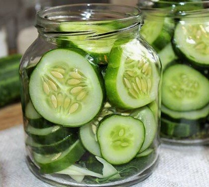 Часто возникает вопрос. Что же делать с переросшими плодами. На вкус они уже не очень. Просто засолить. Они водянистые получаются. Есть выход солить и мариновать кусочками. Сегодня я сделаю обычные огурчики кусочками. Делать буду в маленькие баночки. В дальнейшем увезу в квартиру и буду хранить в кладовой. Расскажу ещё раз. Храним в темном месте и рядом не должно быть отопительных приборов. Подписывайтесь на наш канал. Продукты: Процесс приготовления: 1. Моем огурцы. Отрезаем хвостики и нарезаем на кусочки. Какие хотите. Главное чтобы вам нравились. 2. Подготовим банки и крышки. Банки стерильные, крышки просто обдаю кипятком. 3. Моем листья смородины и чистим чеснок. 4. На дно банки выкладываем листья и чеснок. И сверху огурцы. 5. Кипятим воду 1,5 литра. И кипятком заливаем огурцы. Прикрываем крышками. И даем настоятся 20 минут. 6. Сливаем с банок воду в кастрюлю и ставим на огонь. Добавляем соль, сахар. Кипятим до полного растворения. Выключаем огонь и добавляем уксус. 7. Теперь