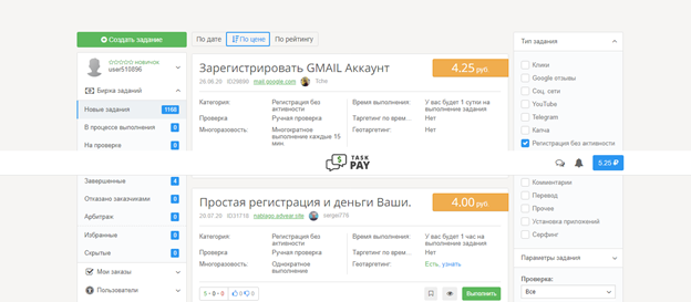 Приветствую читающих! Сегодня речь пойдет о сайтах заработка в интернете, я решил составить некий ТОП 5 САЙТОВ ДЛЯ ЗАРАБОТКА, и если сегодняшняя часть топа покажется кому-нибудь интересной, прошу оставить Коментарии, а продолжение выйдет в скором будущем. Прежде чем представить топ заранее предупреждаю, что это только мое мнение, я работал на всех представленных сайтах, поэтому представлю сколько можно заработать на них. №5-Task Pay. Сайт, где способен зарабатывать абсолютно любой пользователь, здесь все предельно просто. Вам предоставляется список заданий и цена за их выполнение. Цены здесь очень небольшие, но и задания совсем легкие. Например, как представлено на скриншоте выше, мы видим, что можно заработать 4 рубля за регистрацию почты, это займет максимум 5 минут и таких заданий тут много. Подобных сайтов заработка большое количество, но я отдал предпочтение именно этому, потому что функционал сайта очень богатый и удобный. Например, ВЫ можете выставить фильтры для заданий,