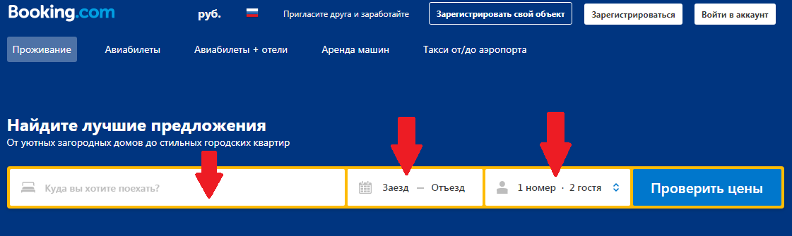 Перейдите на официальный сайт по ссылке booking.com. Перед вами появится поисковая строка, разделенная на три ячейки: «Куда вы хотите поехать», «Календарь Заезд-Отъезд» и «Количество номеров и гостей».
