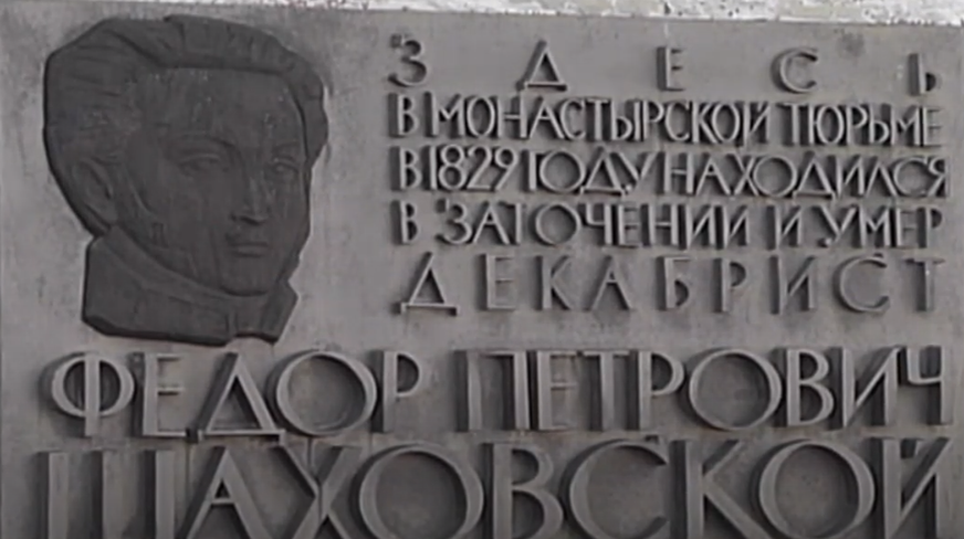 Его жизнь с рождения сулила ему только радости. Но она печально закончится - в Спасо- Евфимиевом монастыре. Сегодня о Фёдоре Шаховском напоминает только эта памятная табличка на тюремной стене. Дело декабристов разбило множество человеческих жизней. И одна из самых драматичных и несправедливых историй связана с Шаховским, - "декабристом без декабря".