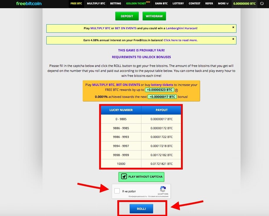 Уважаемый читатель, продолжаем короткий обзор пассивного дохода в интернете на криптовалюте. Протестировал очередной так называемый "кран" по извлечению Биткоина - FreeBitco. Честно говоря неожиданно! Действительно система работает даже в форме развлечения - просто 1 раз в час жмешь на клавишу ROLL!, и помимо этого учавствуешь в еженедельных лотереях, совершенно не вкладывая средства. Кроме того, ресурс работает еще и как Банк, начисляя ежедневные проценты на Ваш остаток сатош на Вашем счету. Единственный недостаток - сайт на английском языке. Но давайте немного поподробнее: 1. Регистрация - с ней не должно возникнуть проблем - она стандартная. Просто нажимаем PLAY NOW - далее вводим свой электронный адрес. Пароль прийдет на почту. 2. При регистрации Вам будет автоматически сгенерирован адрес биткоин кошелька, который Вы можете оставить, либо поменять на свой, уже имеющийся. Делается это в вкладке PROFILE. 3. ........ну вот собственно и все! Жмем ROLL и получаем первые сатоши! Ваш бала