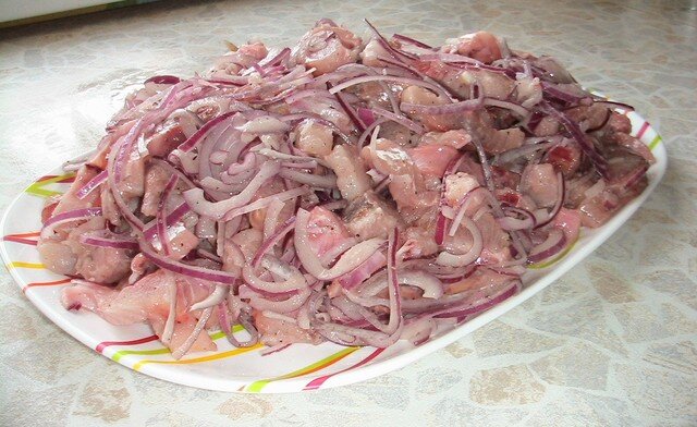 Нарежьте не крупно, добавьте на 0.4кг филе рыбы 1 среднюю луковицу