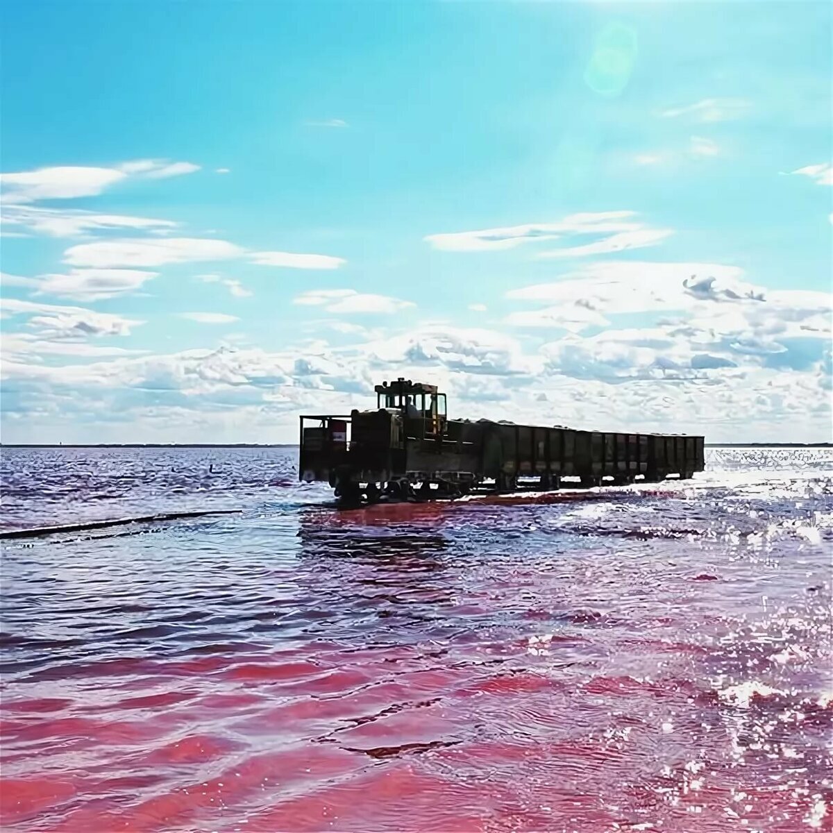 7. Сасык-Сиваш или просто Сасык. Евпатория. Крым. Это самое большое солёное озеро на крымском полуострове (площадь – 75 км²). Расположено оно между двумя курортными городами – Евпаторией и Саками и отделено от Чёрного моря перешейком, по которому проходят автотрасса и железная дорога. Когда-то Сасык-Сиваш был внутренним заливом Евпаторийской бухты, но со временем бури и штормы способствовали появлению песчаной перемычки, которая и превратила залив в бессточный водоём. В розовый цвет воду летом окрашивает бета-кератин, который вырабатывает микроскопическая водоросль Дуналиелла Салина. Розовую соль здесь добывали еще в античные времена – тогда она ценилась наравне с золотом. В начале ХХ века на Парижской выставке розовая соль из крымского озера за свои целебные свойства (лечение дыхательных путей) была отмечена медалью. Есть в озере и лечебные грязи.