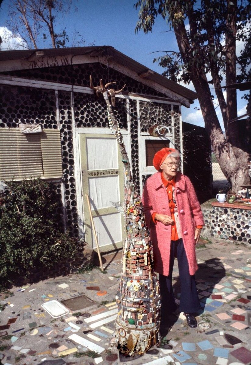 Бабушка Тереза Присбри и ее бутылочная деревня с 16 монументальными строениями из стекла, цемента и выброшенного на помойку пластика. Сими-Вэлли, Калифорния, США. Помните бабушек и дедушек, которые строят во дворах и палисадниках всякие классные сады с божьими коровками, лебедями из покрышек, башнями из пластиковых крышек, игрушками, фигурками, водопадами и другим волшебством? Обычно люди проходят мимо этого творчества в лучшем случае со снисходительной улыбкой и долей внимания. А вот в Калифорнии такой музей под открытым небом признан местным достоянием. Тереза Присбри (1896–1988) построила вокруг своего трейлера целую деревню из бутылок и других предметов, которые можно найти на свалке. Это место стало достопримечательным еще при жизни старушки, которая не останавливаясь сооружала новые бутылочные теремки на своей земле. Мне стало интересно, почему вдруг она решила начать столь неожиданное строительство? Конечно, за этим решением стояла особая жизненная драма и обстоятельства, кот