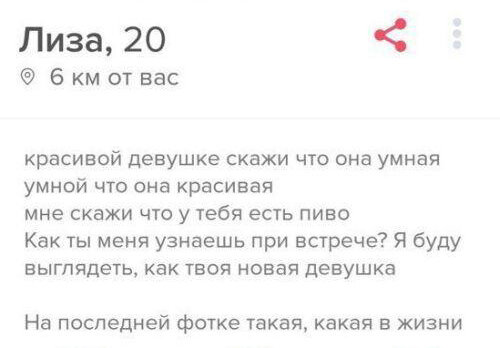 Доброго времени суток! В приложениях для знакомств должны присутствовать фото и описание себя. В нем обычно пишут собственные предпочтения, но некоторые креативят и создают остроумные описания, которые отражают человека, используя шутку. Сегодня посмотрим на такие описания (статусы). Нет, но я знаю как ты узнаешь меня... ацу КТО ТЫ?! Мне также говорит) Дерево-то за что? -Если понравится подборка не забудь подписаться и поставить лайк, так ты очень поможешь.- Принц Никита на белом пони. 411 км подтверждают это. Понимаю... И простоты... Старые статьи... Смешные переписки в чатах ватсап Ч3 Смешные переписки в чатах ватсап Ч4 Смешные переписки в чатах ватсап Ч2 А если вам понравилась статья, то ставьте лайки и подписывайтесь на канал, чтобы не пропустить новые статьи!