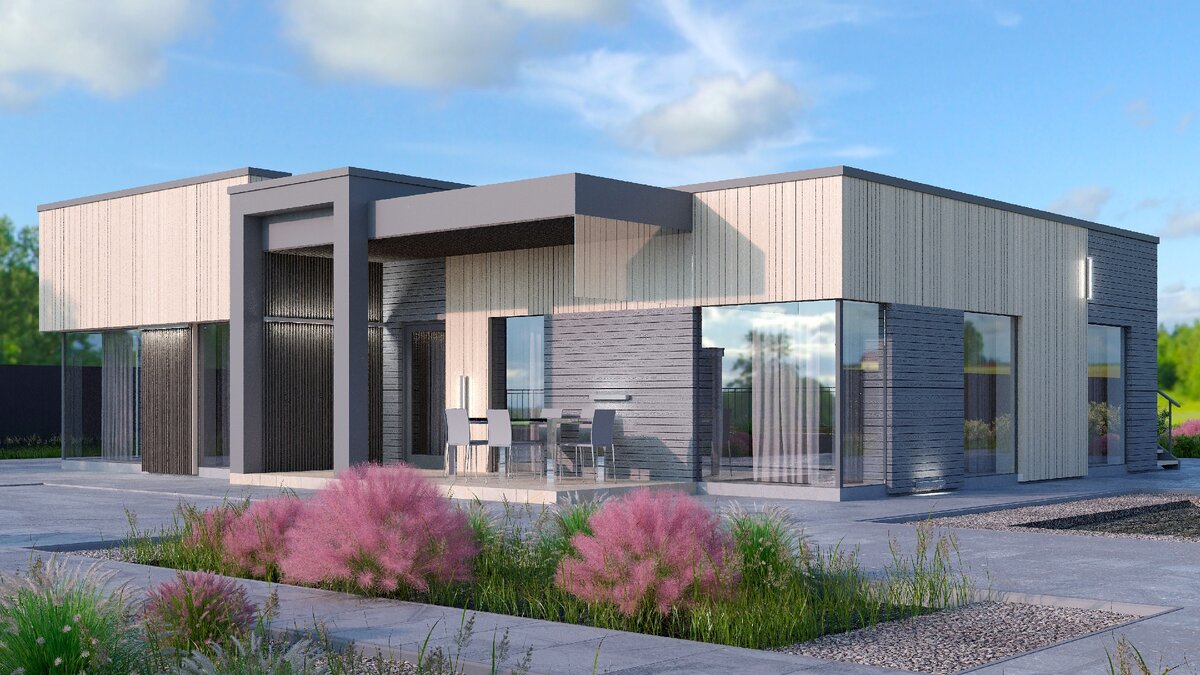 Чтобы внешне дом не был плоской коробкой, искусственно выделены блоки по высоте, с легким выступом вперед и появлением навеса над террасой.