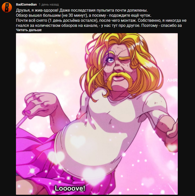 Вот уже как 2 месяца BadComedian не выпускает ролики. Но недавно он опубликовал пост в своём сообществе ютуба, в котором сказано о обзоре очередного фильма