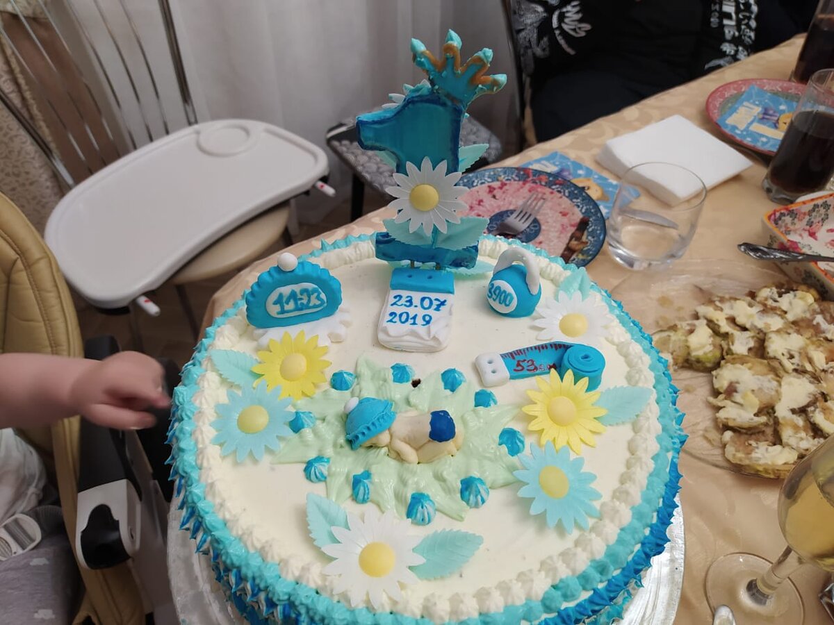 По вкусу #торт просто космический, его стоит попробовать, однако сразу скажу всю эту трудоемкую работу делала моя дорогая мама для моего сынишки на первый день рождения, коржи пеклись по вечерамb после работы, фигурки она делала также сама из сахарной мастики (сначала делали сами, потом все-таки купили готовую в Глобусе за 199 рублей, также там же взяли красители, краситель добавляется в мастику ), надписи делали гелевыми кондитерскими красками, цветочки на торте вафельные их также купили в магазине, фигура малыша сделана из белого шоколада (заливали в готовую формочку).