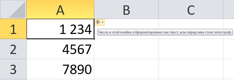 В таблице Excel есть очень много полезных и нужных функций. Только не всегда они помогают. Сейчас расскажу о том, как среди цифр в таблице найти числовые значения в формате текста. Excel проверяет значения в автоматическом режиме. Если с форматом ячейки происходят отклонения, то ты увидишь оповещение в левом верхнем углу с маленьким треугольником. Чтобы узнать причину ошибки, наведи курсор мыши к желтому ромбу с восклицательным знаком и прочти сообщение: Только если было бы все так просто, то я тебе не стал бы писать об этом. Такое сообщение всплывает не всегда. При этом ты всё равно можешь понять, где затерялась ячейка в текстовом формате. Просто обрати внимание на следующие визуальные признаки: · Автоматически числа выравниваются по правому краю; · Если выделена группа ячеек с такими “числами”, то в строке состояния не будет подсказок по сумме, среднему чисел в выделенном диапазоне; · Апостроф стоит первым символом в строке формул этой ячейки. Для наглядности ниже я скинул прим