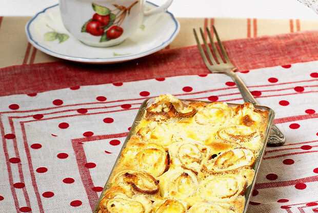 4. Пожарить на рафинированном оливковом масле шесть блинов. Смазать их творогом, свернуть в рулеты. Обрезать края ради ровности, обрезками выложить дно формы для запекания. Каждый рулет разрезать на три части, выставить получившиеся цилиндры в форму.