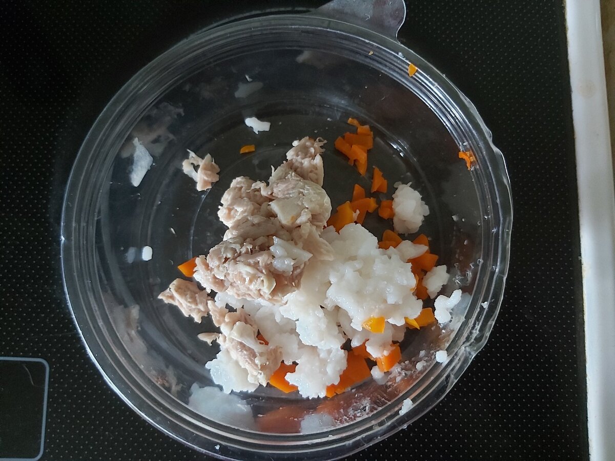 Первый и самый частый вариант выглядит следующим образом: я варю для кота куру, рис или гречу, морковь. Куру и морковь нарезаю мелкими кусочками, рис и гречу остужаю до холодного состояния. После, - перемешиваю все это и выкладываю в миску и перемешиваю.