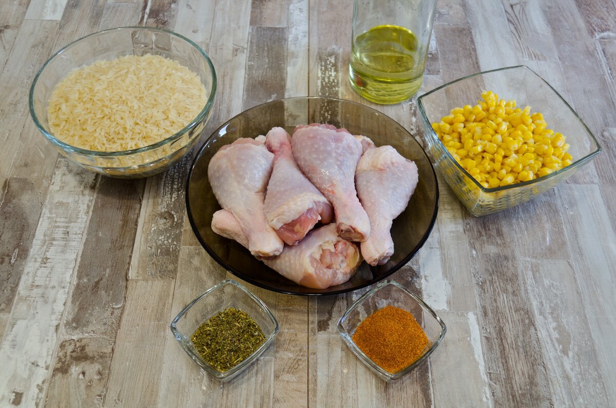 Рис выкладываем в форму, высыпаем кукурузу, перемешиваем и разравниваем. Поверх риса выкладываем курицу. Заливаем кипятком Примерно на 2 пальца выше уровня риса.
