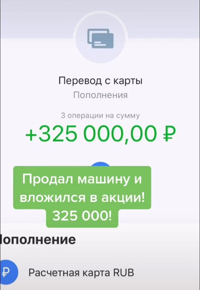 Решил я провести эсперимент,продал свою машину и после удачной сделки и передачи машины новому владельцу. Сел в такси и сразу начал думать,куда же вложить деньги? Вложить их в акции? Положить их под депозит? Или сделать что-то еще? Я конечно же отправился в личный кабинет своего брокера,чтобы пополнить счет на 325 000₽ и после этого подумать. В какие инвестиционные инструменты я буду вкладывать свои деньги? Так как у меня есть конкретная цель О своей цели и планах, я расскажу вам в следующем посте. Оставайтесь на связи и следите за новостями.