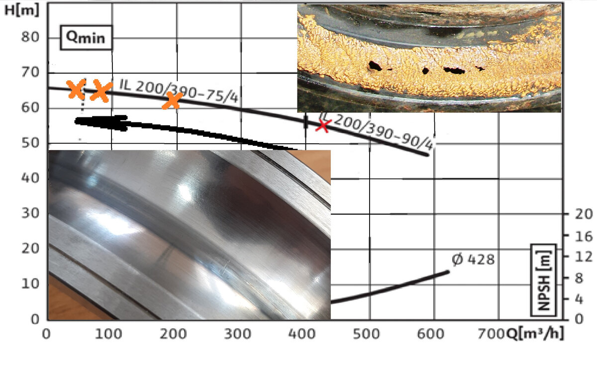 Таким образом, любое отклонение и выход за пределы «проектной рабочей точки» ведет к нестабильной работе насоса и даже к его повреждению и гибели. В данной части разберем на наглядном примере, к чему приводит работа насоса при смещении рабочей точки насоса на его заводской кривой характеристики влево (рис. 1).