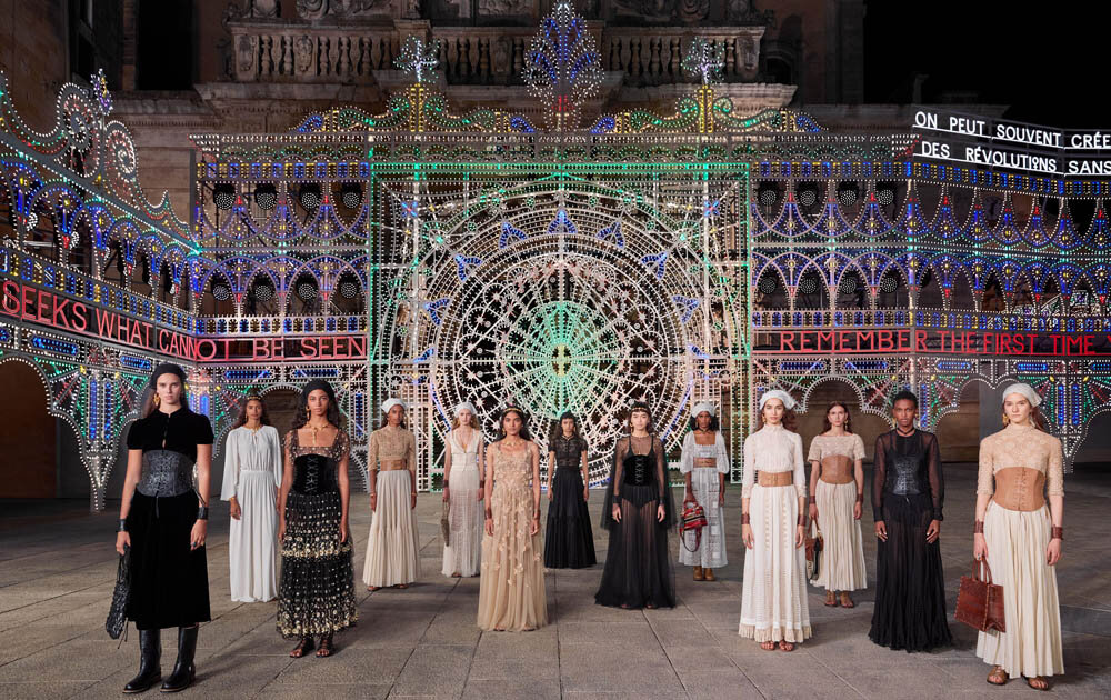 Креативный директор Dior Мария Грация Кьюри представила новую круизную коллекцию, показ которой прошел на площади итальянского города Лечче. В коллекции прослеживались этнические мотивы и были представлены монохромные платья в пол с интересной вышивкой, комбинезоны и костюмы-двойки. Показ проходил на площади Duomo di Lecce под аккомпанемент оркестра, а также сопровождался этническими танцами в исполнении танцевального ансамбля. В конце показа был организован концерт известного итальянского исполнителя Джулиано Санджорджи, который поклонники модного дома Dior могли наблюдать онлайн.