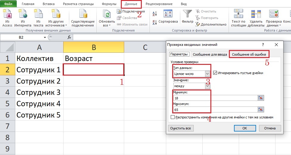 Для корректного заполнения таблицы иногда необходимо ограничить входное значение и предложить некоторые советы для дальнейших шагов. Предположим, ты попросил заполнить возраст в таблице. Люди, которые нужны для твоей статистики, должны быть от 18 до 65 лет. Чтобы убедится, что данные за пределами этого возрастного диапазона не вводятся, переходи в раздел «Данные» после в разделе «Работа с данными» кликай на «Проверку данных». В параметрах выбирай «Тип данных» и указывай минимальный и максимальный возраст.