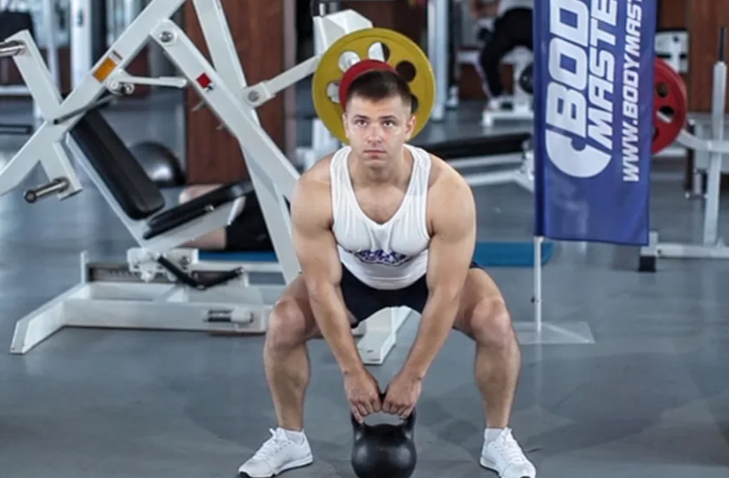 1. Для выполнения нужно принять дальнейшее исходное положение: ноги, согнутые в коленях, поставить как можно шире, гиря располагается на полу между ногами. Спина прямая, лицо смотрит вперед, грудная клетка также направлена вперед. Для выполнения упражнения нужно обхватить гирю кистями обоих рук.