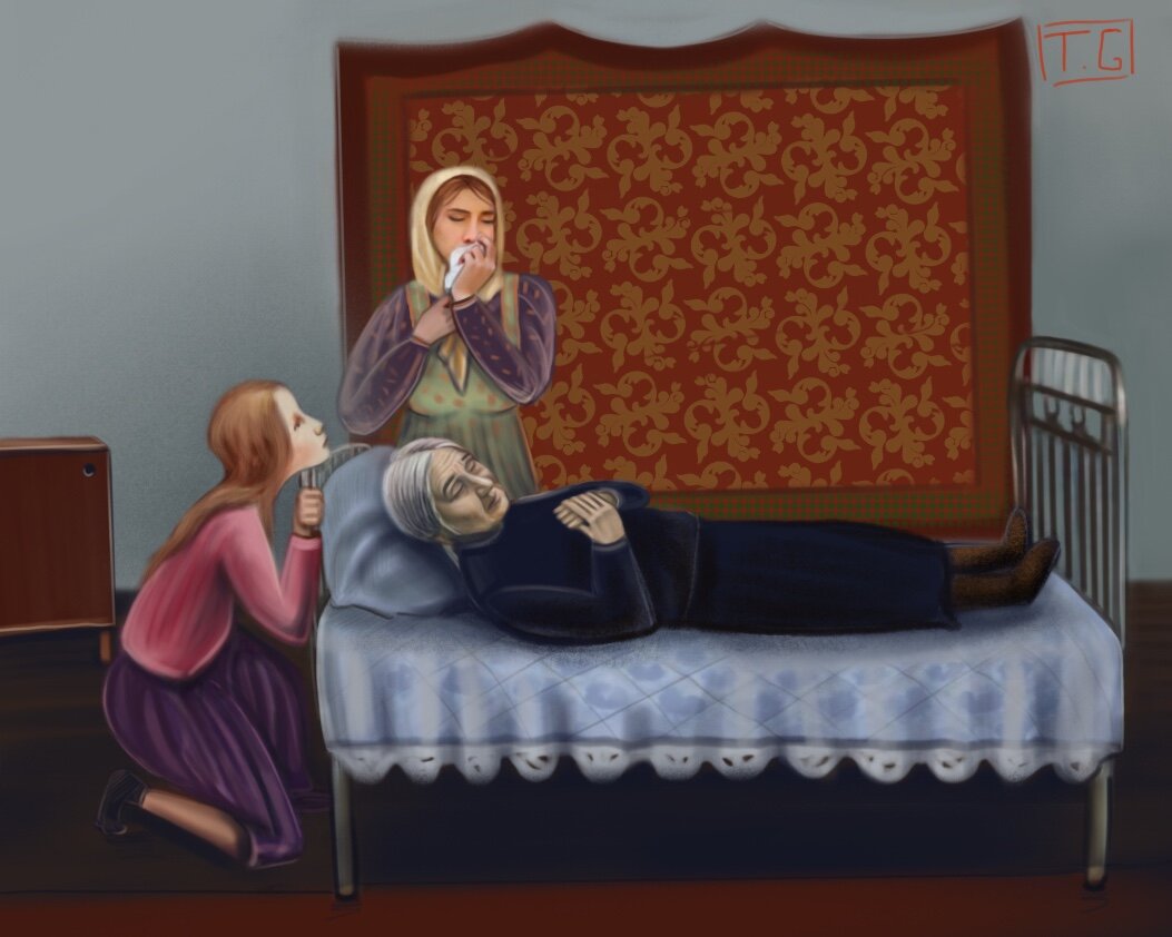Все трое детишек покорно, как цыплята за квочкой, подошли к кровати, где отдыхала старая женщина. — Не серчайте, коль что не так! — громко начала она, когда увидела пред собой три ясных, как изумрудные звёзды, детских личика. — Старалась поступать по-доброму, жить по-праведному, по заповедям Божьим, но нрав был мой тяжёлый, не каждому под силу было со мною тягаться. Любила вас, как умела, где-то ругала, но никогда в обиду не давала, и другим не позволяла. Учила ко всему относиться с лёгкостью, не заострять внимание на плохом, а радоваться тому, что есть. К чему говорю всё это? Выдают вас ваши глазки, не понимаете ничего. А ты, Васька, вижу, всё... Ах!.. Не буду оттягивать. Пришла весточка с небес — нынче день мой последний — умирать буду... Кажись, уже. — И Антонина Брониславовна, издав тяжкий и долгий вздох, точно шелест сухих листьев на ветру, и скрестив руки на груди, прикрыла впалые глаза.
