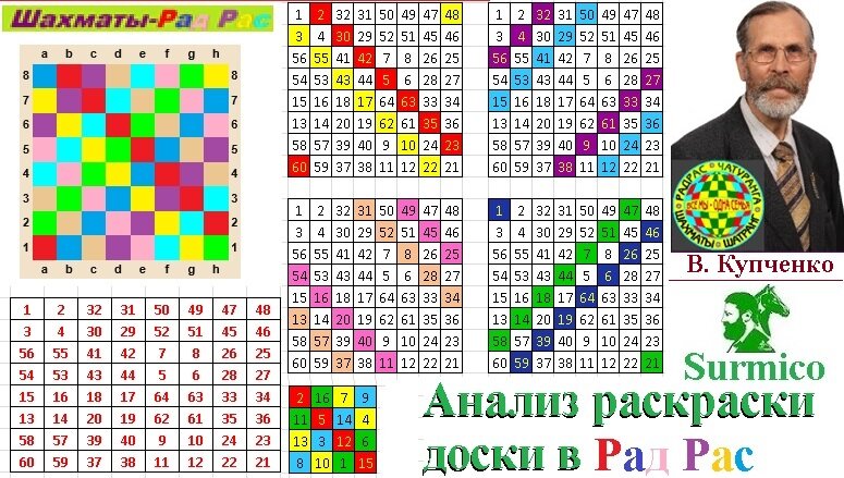 На нашей иллюстрации в левом верхнем углу дана расцветка доски на диаграммах, которые Виктор Купченко любезно предоставил в наше распоряжение.