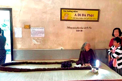Нгуйен Тхи Динх 83 года. Волосы вьетнамка в последний раз подстригала, когда ей было 19 лет. Более, чем за полвека, она отрастила шестиметровую косу, чтобы измерить ее приходится расстилать волосы на полу.