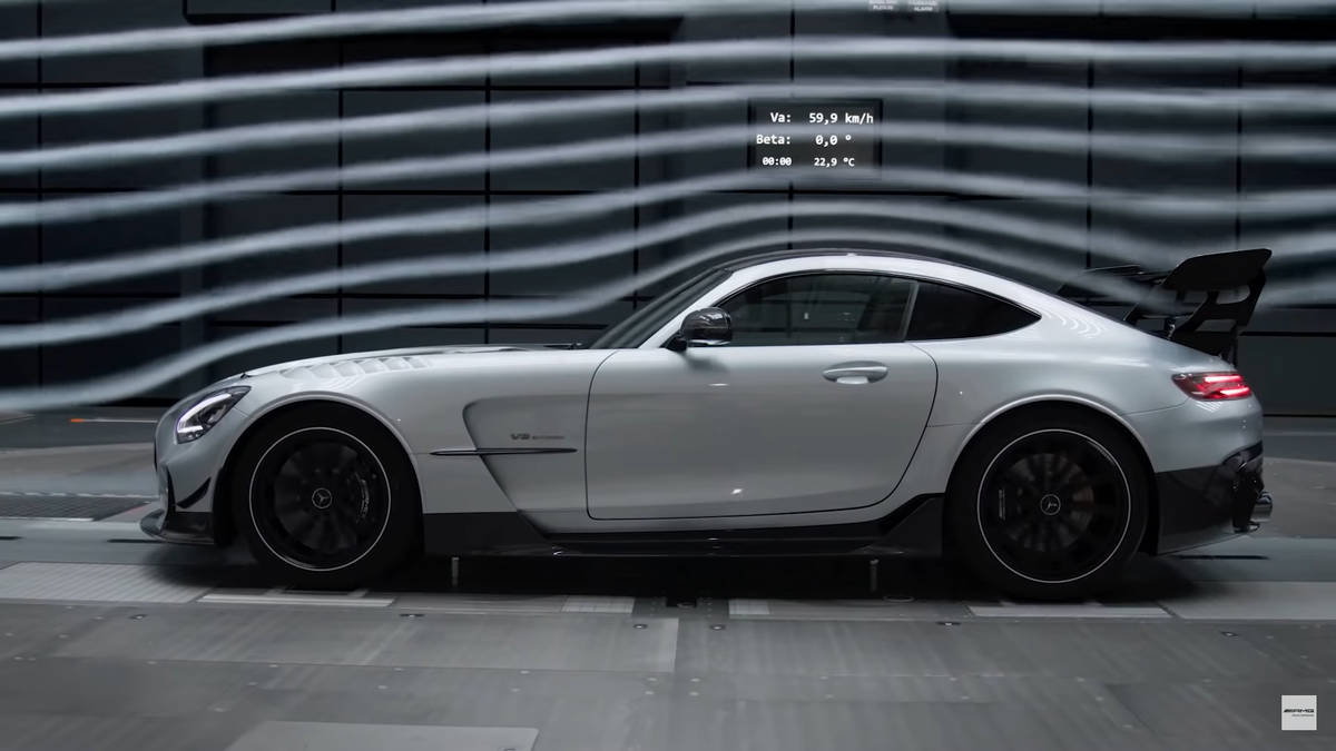 Сегодня обсуждаем аэродиномические характеристики нового Mercedes-AMG GT Black Series. Компания Mercedes-Benz выпустила на официальном канале на Youtube ролик, детально показав новинку в аэродинамической трубе. Автомобиль оснащен v8 объемом 4 литра. При помощи двух турбин двигатель развивает до 730 лошадиных сил. Крутящий момент передается на заднюю ось при помощи углепластиковой трубы. Коробка с активным дифференциалом находится уже позади водителя. 7-ступенчатый робот AMG Speedshift DCT 7G с двумя сцеплениями. Это хозяйство разгоняет машину от 0 до 200 за девять секунд при максималке в 325 км\ч. Тормоза, разумеется, карбон-керамические. Спереди у новой GT широченный воздухозаборник, наследие гоночного GT3. Такой лучше охлаждает двигатель, сжигающий огромное количество бензина, а еще с ним нет необходимости в отдельных впускных отверстиях для радиаторов в колесных арках. Аэродинамический профиль полностью плоского днища расширяется вперед и вниз. Тут в игру вступает эффект Венту