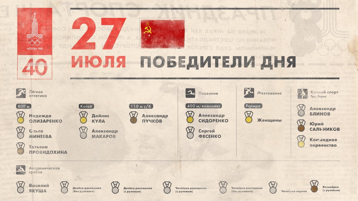 27 июля на московской Олимпиаде разыгрывалось 22 комплекта наград, из которых 8 – в академической гребле, 4 – в легкой атлетике, 5 в плавании, 2 в конном спорте, по 1 в фехтовании, дзюдо, стрельбе и тяжелой атлетике. Александр Сидоренко (ныне – почетный гражданин Мариуполя) и Сергей Фесенко (работает старшим тренером ДЮСШ в Борисполе) заняли 1 и 2 место в финальном заплыве на 400 м комплексным плаванием. Это были наши последние награды в плавании, на этом плавание на московской Олимпиаде завершилось. Николай Солодухин стал олимпийским чемпионом в дзюдо в весе до 65 кг. Уроженец Курской области был также двукратным чемпионом мира. Он бы выиграл Олимпиаду и в 1984, если бы мы поехали, но вместо Олимпиады пришлось выигрывать «Дружбу». В легкой атлетике Дайнис Кула из Латвии стал олимпийским чемпионом в метании копья, вторым стал Александр Макаров из Рязанской области. Александр Пучков из Ульяновска стал третьим в забеге на 110 метров с барьерами. Весь пьедестал наш оказался в женском