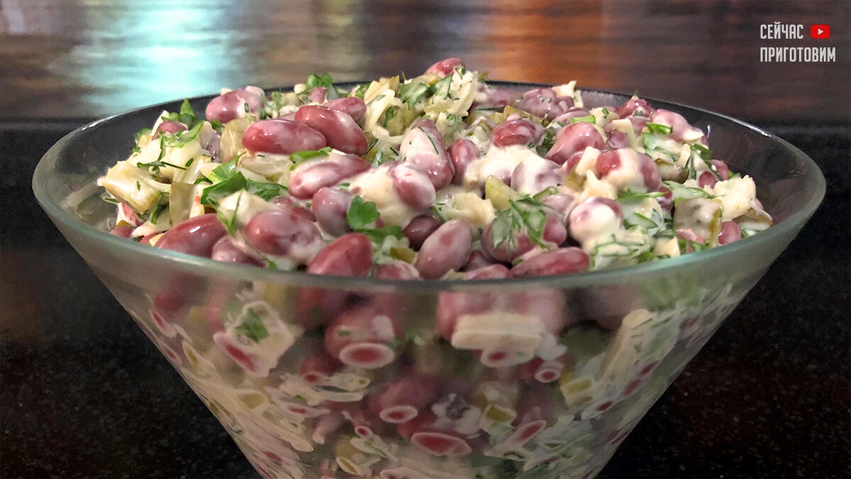 Думаете, что нельзя приготовить салат быстро и вкусно? Предлагаю попробовать очень вкусный салат с фасолью и маринованными огурчиками. Вкусный и быстрый салат с фасолью может стать палочкой - выручалочкой, когда совсем нет времени на приготовление салата. Приготовить такой салат можно буквально за 15 минут, что является большим преимуществом, когда к вам приходят нежданные гости. Салат с фасолью может стать отличным дополнением обеда или ужина, а может занять свое место и на праздничном столе. И не важно какую вы будете использовать фасоль: красную или белую - главное, чтобы вам самим нравилось. На вкус салат будет практически одинаковый , но с красной фасолью салат смотрится ярче и интереснее. Не многие знают, что фасоль богата не только белком - в ней содержатся такие полезные вещества как каротин, витамины группы B, витамин С, цинк, железо, сера, хлор, фосфор, калий, натрий, магний, кальций. Конечно, всего этого не так много, чтобы сделать нас здоровыми с одной тарелочки салата, н