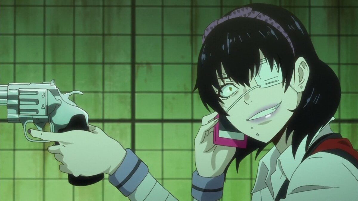 И , ах , да . Что там под повязкой ? Глаз , способный видеть сквозь рубашку карт или барабан револьвера ? А вот и нет . Там нет абсолютно ничего . Помните , я уже говорил , что у девочки БЕДЫ с башкой ? Маньячка проиграла глаз президенту студенческого совета , а после выколола его себе перьевой ручкой .