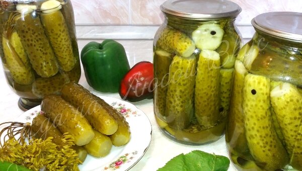 Хрустящие и вкусные огурцы на зиму можно приготовить без стерилизации, без хрена и листьев смородины и вишни. Готовить маринованные огурцы буду в литровых банках, с уксусом. Это наш семейный и проверенный рецепт, огурчики вкусные, отлично хранятся в квартире. Приготовьте, у Вас обязательно будут просить рецепт! Маринад вкуснейший, огурцы сохраняют свой хруст. К тому же, поэтому рецепту можно приготовить и помидоры, даже ассорти. Как посолить, замариновать огурцы на зиму в литровых банках без хрена? Смотрите пошаговый рецепт с подробным видео: Хрустящие огурцы на зиму без стерилизации. Пошаговый рецепт 1. Подготавливаем огурцы: тщательно моем их новой губкой, удаляя белесый налет и песок (налет обычно у домашних огурчиков, с грядки). Выбираем огурцы желательно одного калибра, обязательно без повреждений и гнили! 2. Замачиваем на 1-2 часа в холодной воде. Если собраны давно или покупные, то на часа 3, за это время один раз нужно будет поменять воду. Если огурцы не вымачивать, то в коне