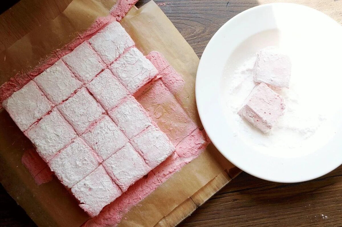 9. Нарезаем маршмеллоу на квадратики и обваливаем в этой смеси.