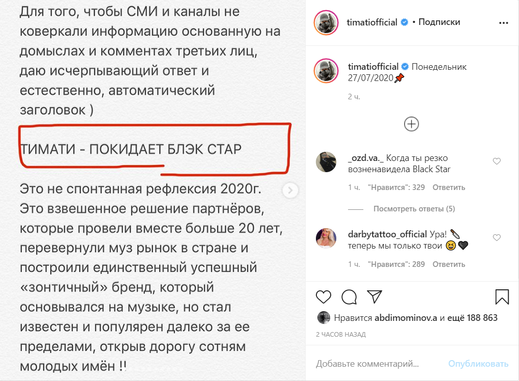 Тимати покидает Black Star, об этом он написал в своем инстаграме