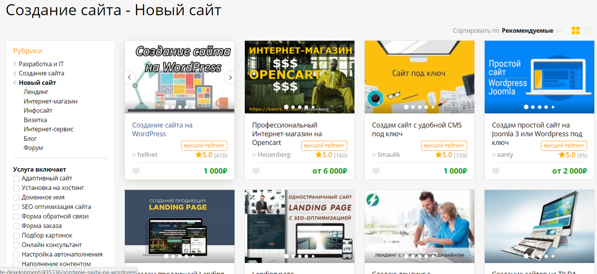 Если вам захотелось начать зарабатывать в интернете, не имея при этом ни опыта ни средств, но у вас под рукой есть хотя бы телефон или компьютер с доступом к интернету, то эта статья точно вам подойдет. Суть заработка? Многим в интернете нужны свои сайты, либо настройка уже имеющихся. Кому-то для магазина, кому-то для личного блога и т.д. За их создание платят хорошие деньги, за настройку - чуть поменьше, но тоже неплохо. Именно на этом мы с вами и сможем заработать. P.S. Вам не нужно уметь производить какие-либо действия с сайтами (создавать, настраивать и т.д.), просто прочтите до конца и вы все поймете. Сама схема Так как сами делать сайты мы не умеем, то первым делом нужно найти того, кто сделает все за нас. Для этого можно зайти на различные биржи фриланса, например, на kwork.ru: Предложений очень много, у всех исполнителей отличный рейтинг. Можете сразу найти подходящего и запомнить, либо просто прицениться, чтобы знать, что сказать заказчику в будущем. Дальше нужно найти покупа