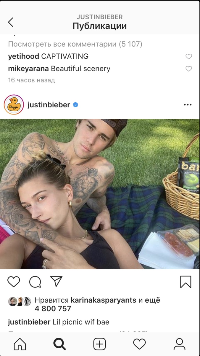 Аудитория Джастина в Instagram составляет 142 млн. Публикация певца набрала уже почти 5 миллионов лайков. Также артист подписал фото: «Lil picnic wif bae», что означает «не большой пикник с моей девочкой» Напомни, что Хейли, дочь известного актера Стивена Болдуина. Раньше, до отношений с Джастином, Хейли была фанатской Бибера и очень любила его творчество. И кто бы мог подумать, что в будущем они будут парой и даже стану мужем и женой.
