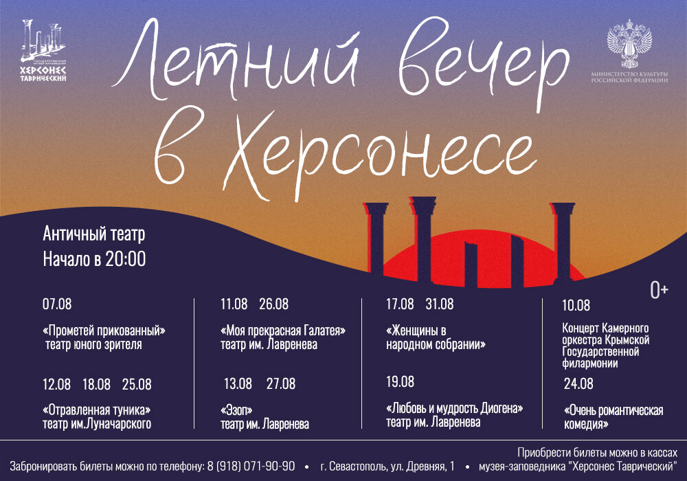 Театральный сезон в Херсонесе в самом разгаре. В августе вас ждет насыщенная программа мероприятий под открытым небом. В рамках нашего проекта «Летний вечер в Херсонесе» в Античном театре проходят спектакли севастопольских театров и концерты известных коллективов.