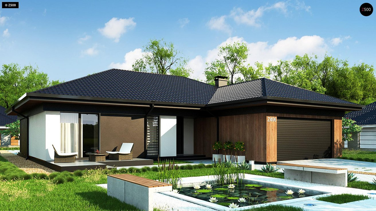 Z406 представляет собой одноэтажный дом с большой площадью остекления в гостиной. Нетипичная форма строения и сложная конструкция кровли делают проект привлекательным для сторонников европейского стиля архитектуры.