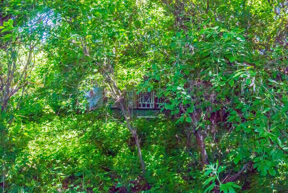 Дом этот находился в очень густых зарослях. Сначала шла крапива выше пояса, затем пошла непролазная поросль деревьев. Преодолев все эти заросли, мы наконец-то увидели за деревьями заброшку.