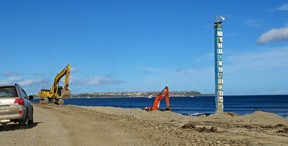 Стержень Кунашира - это трасса Южно-Курильск - Головнино. Она реально трасса - с неплохим потоком машин, так что даже автостоп вполне уместен, и бесплатным автобусом, три дня в неделю утром и вечером проезжающим её из конца в конец. В основном это грунтовка, но в отличие от почти-не-дорог Итурупа, вполне ровная, укатанная и удобная для езды. Кое-где же и вовсе кладут асфальт, в чём участвуют, например, машины с кадра выше.