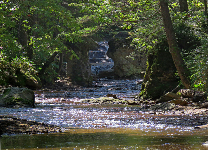 Наверное, мы бы плескались тут, ныряли в чаши, лежали в струях до вечера. Но в какой-то момент снизу по течению показалась брутального компания с пивом, ушедшая куда-то выше по ручью. Ещё через полчаса вверх по течению проехал целый джип, разбрызгивая воду колёсами, а спустившись назад к Лесной речке, мы увидели на её берегах пяток машин с приехавшими на пикники компаниями. Столбчатый и Мендель - достопримечательности для туристов, а Кислый ручей - для самих островитян.
