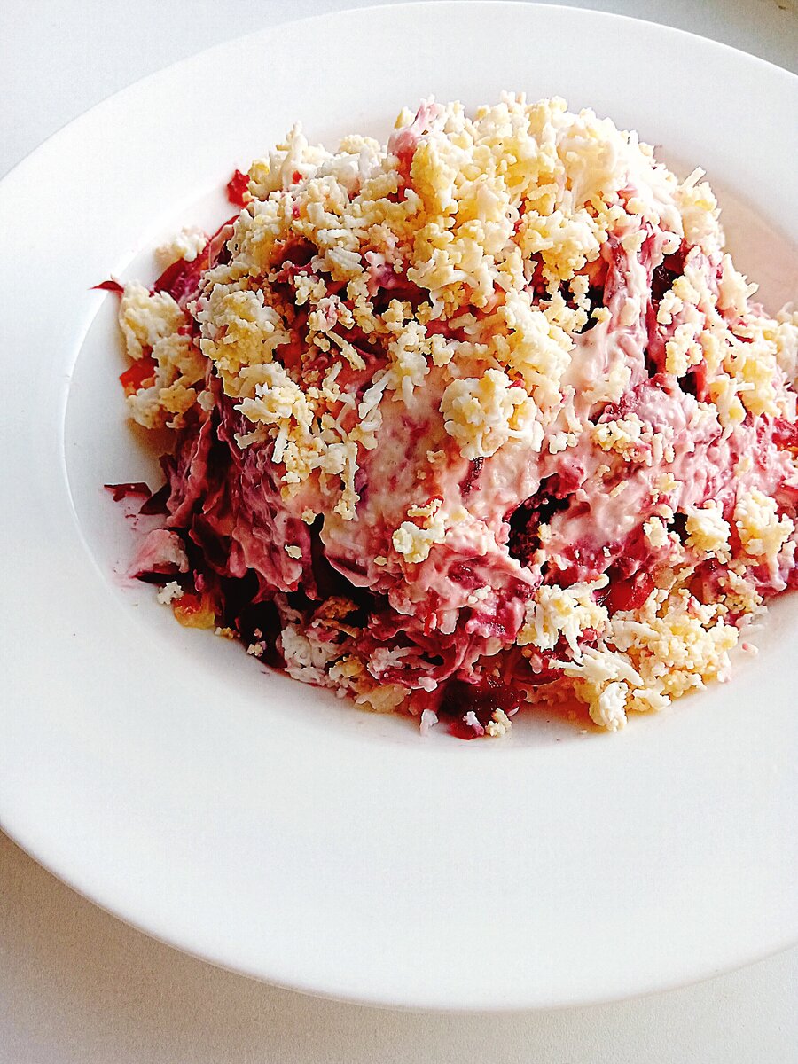 Всем привет 🙂 Сеголня у нас 👉 Сельдь под шубой 🔻Ингредиенты на две порции: Сельдь - 100-150 гр. Картофель 🥔 - 2-3 шт. не больших Свекла - 1 шт. Морковь 🥕 - 1 шт. среднего размера Яйцо 🥚 - 1 шт. Лук - 1/2 шт. маленький Майонез 🔻Способ приготовления: Сперва мы все овощи и яйца отвариваем и остужаем. Пока овощи готовятся, нарезаем мелко лук и селёдку на маленькие кубики. Когда овощи у нас готовы, приступаем к готовке 🥗 салата. Я его делаю сразу на тарелку, получается в виде пирамидки. Первым слоем натераем на тёрке картофель одну штучку, затем выкладываем сельдь и лук, если Вы любите посочнее и пожирнее, то каждый слой смазывайте майонезом. Я майонезом смазываю только последний слой. Так после лука натераем опять картошечку, сверху морковочку и ещё раз картошечку. На картошку натераем свёклу, смазываем майонезом и завершаем всё это яйцом. 🔻Ещё люблю добавлять маринованные огурчики, но в этот раз без них. Огурцы обычно выкладываю после лука. Подписывайтесь на мой канал ♥
