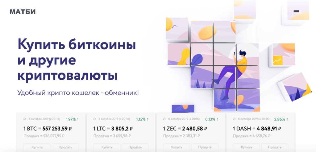 Сервис Матби – это не только обменник, позволяющий покупать и продавать биткоины по выгодному курсу, но и кошелек, который способен обеспечить надежное хранение криптовалюты. Надежность сервиса подтверждается длительным существованием – он работает уже несколько лет – и хорошими отзывами пользователей. Купить Bitcoin можно с использованием банковских счетов, Яндекс.Денег и Qiwi. Сайт имеет русский и английский интерфейс. Матби отличается удобством: для оплаты покупок достаточного одного клика. Нужно обратить внимание, что обработка заявок на ввод и вывод биткоинов выполняется круглосуточно. Для ввода и вывода рублей действует другой режим: такие заявки обрабатываются каждый день, но только с 8-00 до 24-00. Размер комиссии зависит от того, каким способом производится перевод (от 0% до 4,5%).