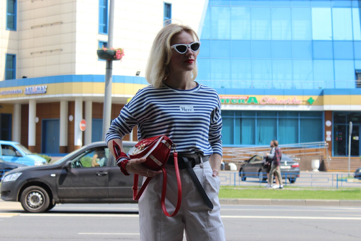 Матросская тельняшка точно создана для летних беззаботных образов! Яркие полоски сами по себе являются акцентными, поэтому лучше, если вещи – компаньоны будут однотонными и лаконичными. При этом аксессуары – очки в белой оправе и красная сумка на полосатом фоне смотрятся максимально эффектно.